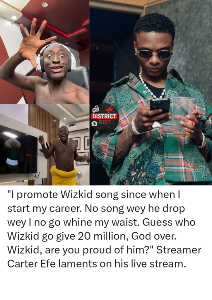 In a recent live stream, Nigerian content creator and streamer Carter Efe opened up about his long-standing support for Wizkid and expressed disappointment over the lack of recognition. He said, “I promote Wizkid’s songs since I started my career. No song he drops that I don’t vibe to. Guess who Wizkid gave 20 million? God over. Wizkid, are you proud of him?”