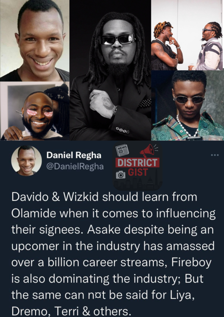 Nigerian social media personality Daniel Regha has recently shared his thoughts on the music industry, offering advice to two of Nigeria’s biggest stars, Davido and Wizkid. In his latest post, Regha suggested that the two superstars should learn from Olamide when it comes to managing their artists.