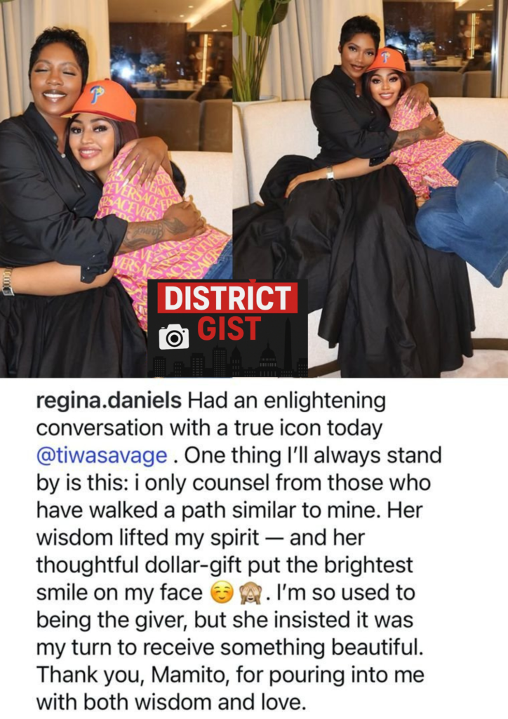 Regina Daniels, the famous Nollywood actress, recently shared some powerful words on social media after her meeting with Nigerian music icon Tiwa Savage. In a post that has fans talking, Regina said, “I only receive counsel from those who have walked a path similar to mine.”
